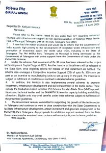 వరంగల్ ఎంపీ డా. కడియం కావ్య వినతిపై స్పందించిన కేంద్ర టెక్స్టైల్స్ మంత్రి గిరిరాజ్ సింగ్, ఇప్పటికే రూ.30 కోట్ల తొలి విడత నిధులు విడుదల చేసినట్లు తెలిపారు. తదుపరి విడత నిధులు అర్హతల ప్రకారం విడుదల చేస్తామని వెల్లడించారు.